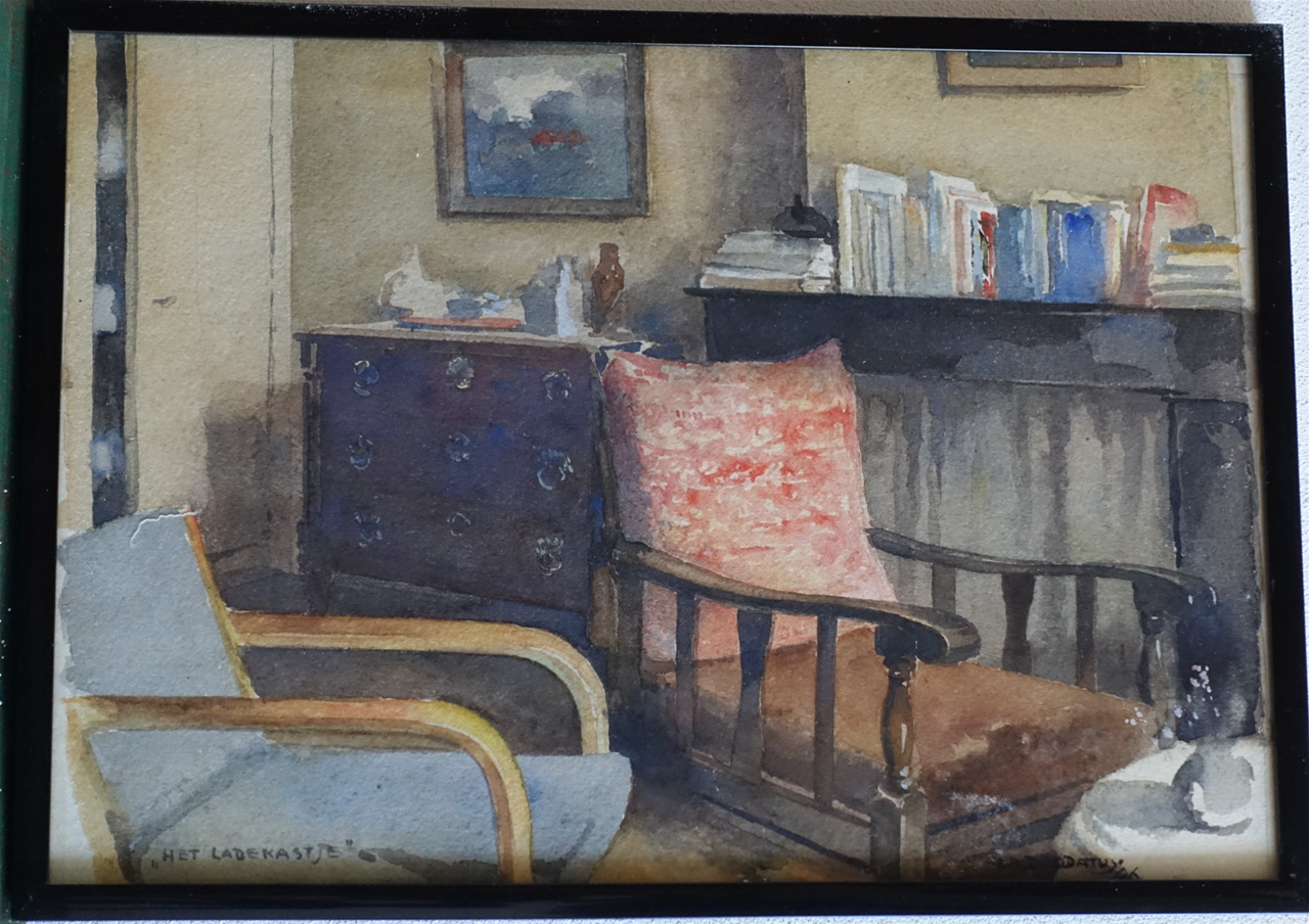 aquarel, 1946, de nieuwe gezamelijke zolderkamers op de Frans van Mierisstraat te Amsterdam.